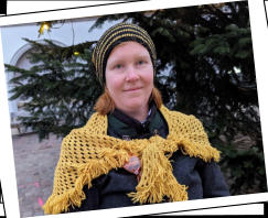 Schurz, das gelbe Schultertuch und die Ringelsocken in den Leonberger
